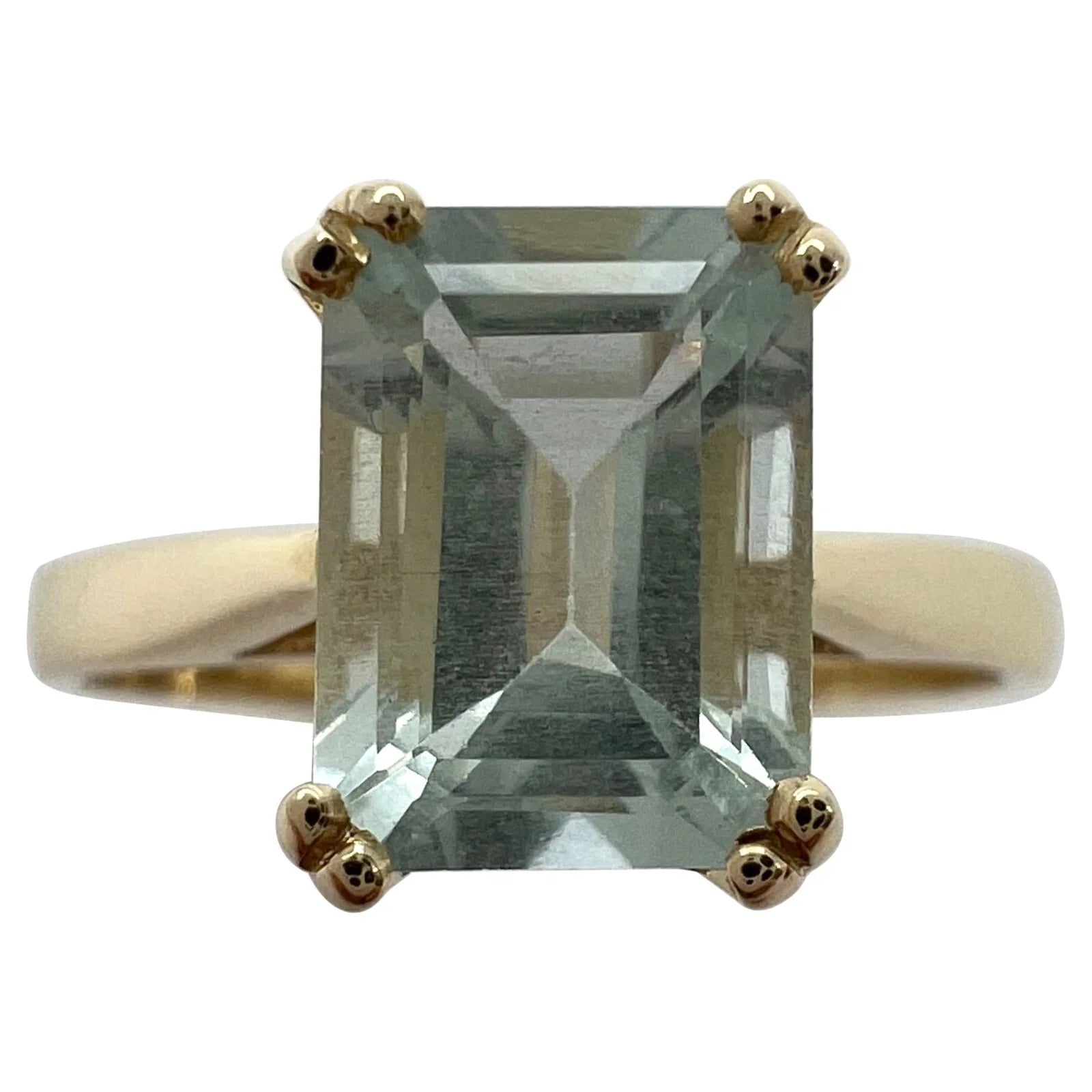 Light Blue Emerald Cut Aquamarine Solitaire Yellow Gold Ring.